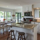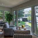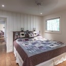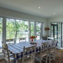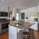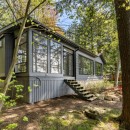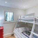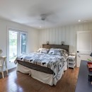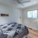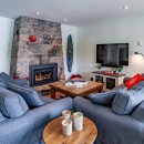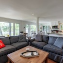 Inside the cottage, the main level showcases an open-concept kitchen that flows seamlessly into the dining and living areas. The kitchen is equipped with high-end appliances, a central island with bar seating, and stone countertops. The dining room offers a casual table with a lake view, seating eight comfortably. The living room features two large sofas positioned to enjoy the smart TV or cozy up to the gas fireplace, with additional seating provided by two armchairs. The Muskoka room, with its three sides of windows and gas fireplace, invites you to relax while taking in the beautiful surroundings.