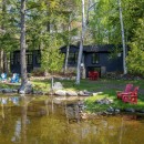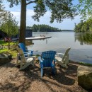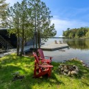 The property boasts level grounds that surround the cottage, featuring a fire pit at the water's edge and multiple entry points to the shallow sandy shoreline. At the end of the dock, the water depth is approximately four feet, perfect for swimming. The dock offers ample space for relaxation, with room for two loungers and an umbrella, as well as additional seating on the boathouse rooftop deck.