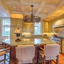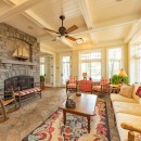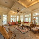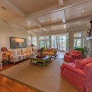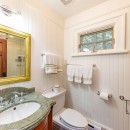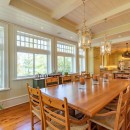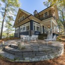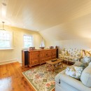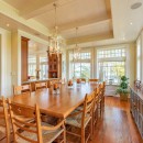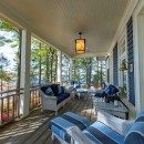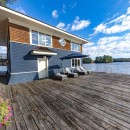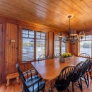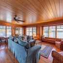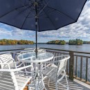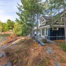 The main cottage features a welcoming front porch where you can relax in the summer breeze. The open-concept kitchen is equipped with high-end appliances, including two Miele dishwashers and a KitchenAid gas stove, making it a delight for any home chef. The dining room, which accommodates 14, flows seamlessly from the kitchen, while the cozy Muskoka Room and living room invite you to gather around the two-sided wood-burning fireplace. Floor-to-ceiling windows provide breathtaking views and easy access to outdoor spaces.