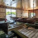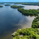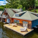 The charming boathouse enhances the experience with its rustic Muskoka-style interior, complete with a stone fireplace, a full kitchen, and a cozy bedroom. The multiple outdoor decks and a private balcony allow for serene lakefront lounging, while the interior boat slip adds convenience for water activities.