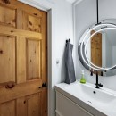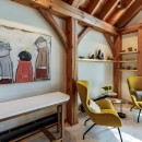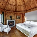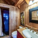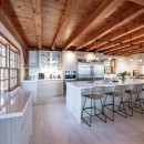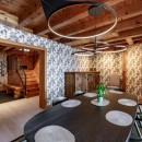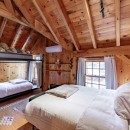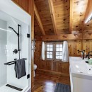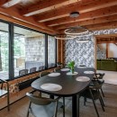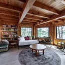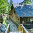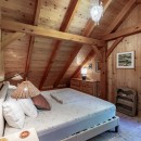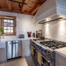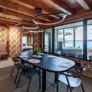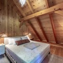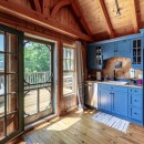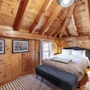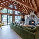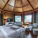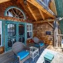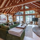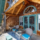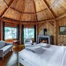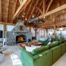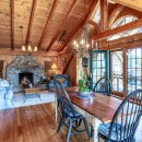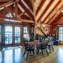 Inside the main cottage, the kitchen is a chef's dream, boasting ample counter space, high-end appliances, and a large island with bar seating. The intimate dining room offers picturesque lake views and comfortably seats eight. The great room, designed for seamless flow, features a stunning natural stone wood-burning fireplace and floor-to-ceiling windows that open up to a lake-facing deck. A custom sectional sofa and multiple armchairs create a welcoming space for relaxation and entertainment.