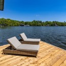This spacious two-storey cottage is perched on a point of land, offering stunning elevated views over the lake. The property features comfortable seating areas with Muskoka chairs, a casual fire pit, picnic tables, and a hot tub, all surrounded by a gentle slope leading down to the boathouse. The well-lit granite path guides you to multiple deck spaces at the boathouse, complete with dining areas and lounge chairs, perfect for soaking up the sun or enjoying a meal al fresco.