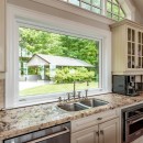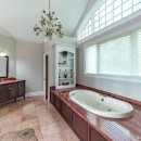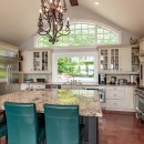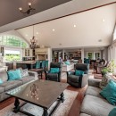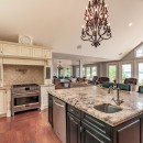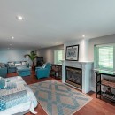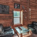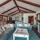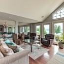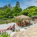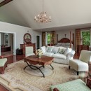 Inside the main cottage, the interior is equally impressive. The open-concept kitchen boasts stainless steel appliances, a gas range, cathedral ceilings, granite countertops, and a breakfast island. The dining room, with its cathedral ceiling and chandelier, opens onto a patio, seamlessly blending indoor and outdoor living. The great room, adorned with hardwood floors and a fireplace, leads out to the terrace through double doors, while the living room offers cathedral ceilings and terrace access.