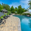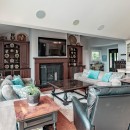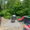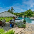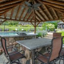 Outside, the pool house complements the outdoor experience with an oak bar, built-in cabinetry, a fridge, wet bar, and a stone gas fireplace—perfect for hosting gatherings and enjoying the expansive patio area.
