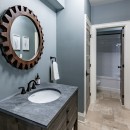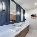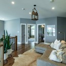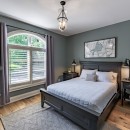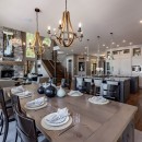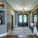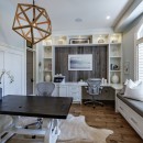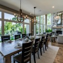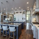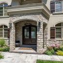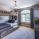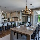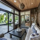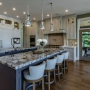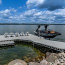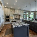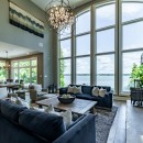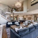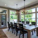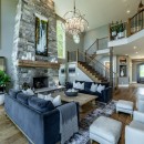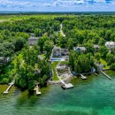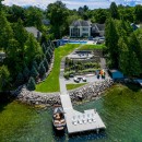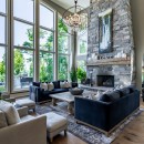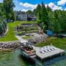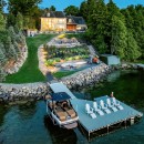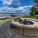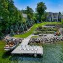 Inside, the main level features a chef's dream kitchen with high-end appliances, rare semi-precious gemstone countertops, and a walk-in pantry. Expansive windows in the dining room offer stunning lake views, complementing the great room with its stone fireplace and comfortable seating. A Muskoka room provides a serene space to enjoy the outdoors from within. The mudroom offers practicality with a washer/dryer setup and ample storage, while the office provides a productive workspace with built-in storage and seating.
