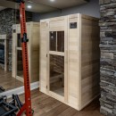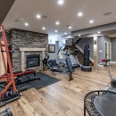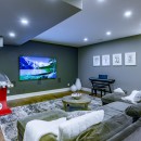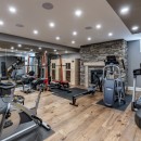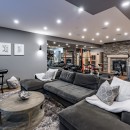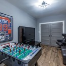 Upstairs, a loft sitting area offers additional relaxation space. The lower level boasts a rec room with a large TV and sectional sofa, a games room with entertainment options like foosball and bubble hockey, and facilities including a sauna and exercise room.