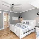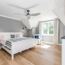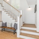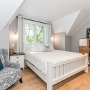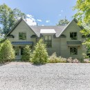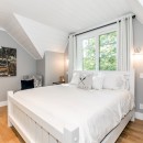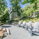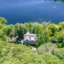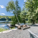 This brand new lakehouse is just 50 feet from the water's edge, surrounded by beautifully landscaped grounds. As you approach, you’ll be greeted by stairs leading down to the entrance and further down to the lake, where clear, deep water invites you for a refreshing swim. The spacious deck is perfect for lounging, equipped with Muskoka chairs and a sectional sofa under an umbrella. For a relaxing afternoon, enjoy the shallow sandy entry at the shore, or gather around the fire pit with friends as the sun sets over the calm bay.