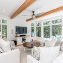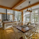 Step inside to discover the stunning interior. The main level features a luxurious kitchen equipped with high-end Miele appliances, a Liebherr fridge with an ice maker, and an island with seating for four. The open-concept dining room overlooks the lake and comfortably seats eight, making it ideal for family meals. The great room boasts cathedral ceilings and floor-to-ceiling windows, with a cozy wood-burning fireplace surrounded by plush sofas and swivel chairs. The sunroom, filled with natural light, offers two plush sofas (one of which is a pull-out queen bed) and a flatscreen TV with surround sound, all while providing breathtaking views of the lake.