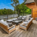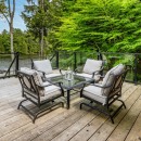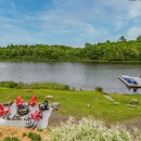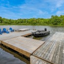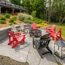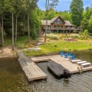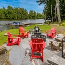 The property features a stately gated driveway and privacy fence, ensuring tranquility from both the road and shoreline. Spanning 4 acres, the grounds are meticulously groomed, with flat flagstone paths and granite steps leading gently to the lake. The large U-shaped dock has a natural sandy bottom, with water depths of 4 feet off the end, ideal for swimming and relaxing. An oversized deck stretches along the lakeside, complete with Muskoka chairs, loungers, and a fire table. Just steps from the water, a cozy lakeside firepit surrounded by 7 Muskoka chairs invites evening gatherings.
