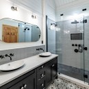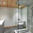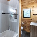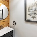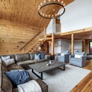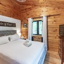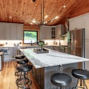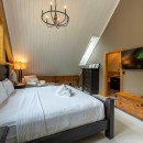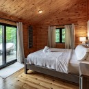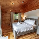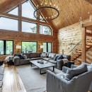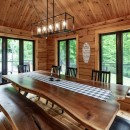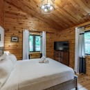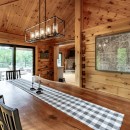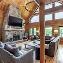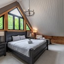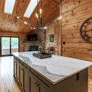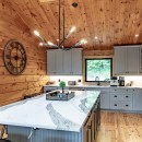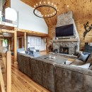 Inside the cottage, the main level features a bright kitchen with newer appliances, a gas stove, and an oversized island that seats six. A beverage center with a bar sink, ice maker, and wine fridge adds convenience, while a charming nook with a propane fireplace offers a cozy spot for relaxation. The separate dining room, furnished with a stunning live edge table, accommodates 12 guests and opens to the deck for seamless indoor-outdoor dining. The great room boasts vaulted ceilings, a grand wood-burning granite fireplace, and floor-to-ceiling windows that showcase breathtaking views.
