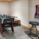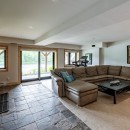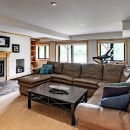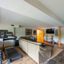 The lower level is designed for recreation, featuring a spacious rec room with a leather sectional sofa, wall-mounted TV, and propane fireplace. A well-appointed workout area includes a treadmill and weights, while a patio walkout leads to a flagstone path connecting to the hot tub and outdoor grounds.