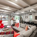 Upstairs, a loft area between two bedrooms provides a serene reading nook with full lake views. The garage has been creatively converted into a fun games and TV room, complete with a dining table for board games, comfortable seating, and a mini fridge for refreshments.