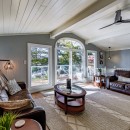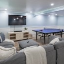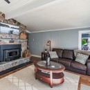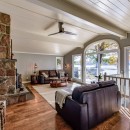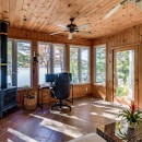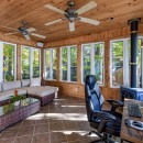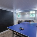 Inside, the main level boasts a lovely kitchen and an open-concept dining room with seating for eight. The living room features a stone wood-burning fireplace and a TV, surrounded by comfortable sofas. For those who need a quiet workspace, the screened-in Muskoka room provides a stunning lake view. The lower level includes a cozy rec room with a gas fireplace, seating areas, a ping pong table, and more.