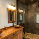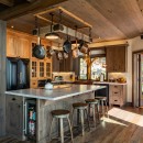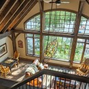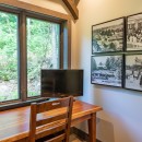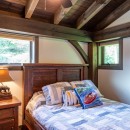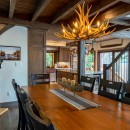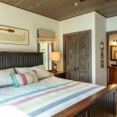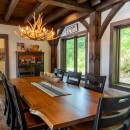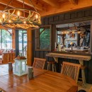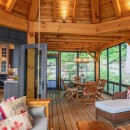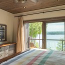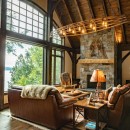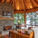 The interior of the cottage is thoughtfully designed for both relaxation and entertainment. The gourmet kitchen features a granite island with seating for four, high-end appliances, and a beautiful lake view. The dining room can accommodate ten guests under an elegant antler chandelier, while the great room boasts soaring ceilings and a wood-burning fireplace, creating a warm and inviting atmosphere. The Muskoka Room stands out with its swing couch and gas fireplace, making it an ideal spot for year-round enjoyment.