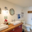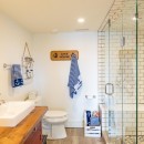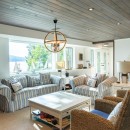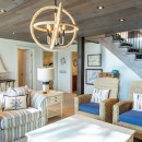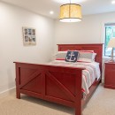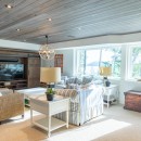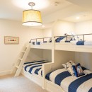 For families, the cottage is equipped with a variety of kid-friendly amenities, including a slide raft, lily pad, kayaks, a sand box, and a playground. The lower level offers a nautical-themed entertainment space complete with a large TV and play area, ensuring that guests of all ages can find their favorite spot to unwind.