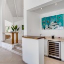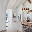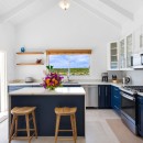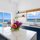 A modern, ocean-view kitchen with a center island and chef-grade appliances anchors the villa’s open-concept design. Enjoy meals at the custom-crafted indoor dining table or dine outdoors on the expansive deck with views across the harbor.
