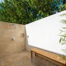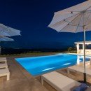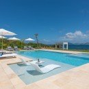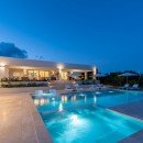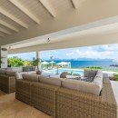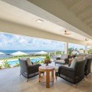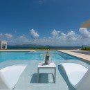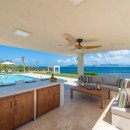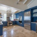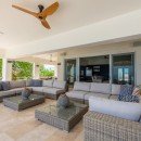 The villa is also equipped with a classic wrap around verandah that is furnished with banquette sofas, dining spaces, and cozy niches for enjoying drinks or conversation. Head inside and the same, modern and clean esthetics prevail. The high, white ceilings and soothing sandstone floors bring in the sunlight from outdoors while a palette of grey, sea blue and green create a Zen-like calm in the TV lounge, dining area, and even the large kitchen. With its stainless appliances and rich blue cabinetry, it is a charming spot that opens directly to one area of the terrace.