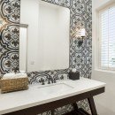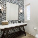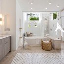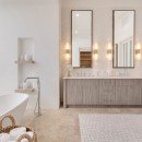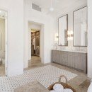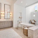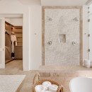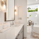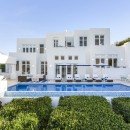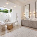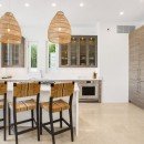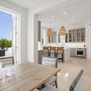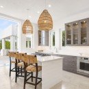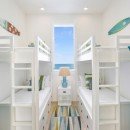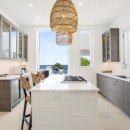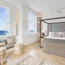 The shared living spaces include an enormous gourmet kitchen, large living room with oversized furnishings, formal dining area and other interior lounging spaces all decorated with contemporary charm emphasizing the natural blue and white palette.