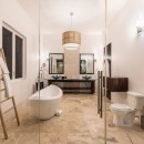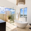 The three bedrooms continue this light and yet energizing atmosphere, using a base palette of bright white and black accented with red. Artwork and décor create a contemporary feel, and yet it is also an elegant and soothing space for all. All bedrooms are master suites, and on the first floor the bedroom has a private patio and large ensuite bath. The remaining two are on the second floor with terraces and luxurious baths.