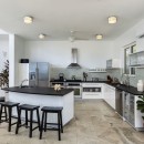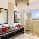 Inside, the villa has a formal dining area that opens into the gourmet kitchen. Using a sun-soaked palette of lime green, black and red, this room also contains the living room and media area. High ceilings ensure you feel the airiness of the setting, and the views from inside are remarkable.