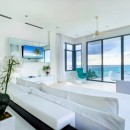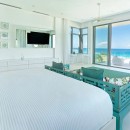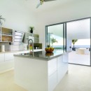 Nearby, an al fresco dining area allows you to savor meals or drinks in full view of the sea, and even if you step inside, the enormous banks of glass and the impressive scale of the great room captures the breezes and the light. A large banquette sofa and modern armchairs define the living room. The formal dining room is a pristine white, and it faces into the enormous, modern kitchen. Because your stay means you enjoy the services of a chef, you don't have to step inside, but it is such a delight, you will probably want to spend time using some of the modern appliances and the beautiful working spaces.