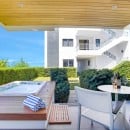 This room offers outstanding views through the glass doors that go from floor to ceiling throughout most of the living space. Beyond the living room and bedroom, there’s also a terrace that boasts a hot tub and other furniture so guests can enjoy the breeze and sunshine right in the condo itself. Perfect for a romantic getaway, the condo is fully equipped, and guests can add extras like a private chef and massage services to add extra luxury to the trip.
