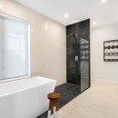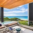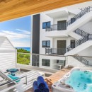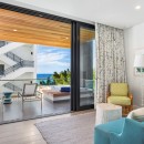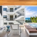 The living area of the condo has a 65-inch television and leads to a furnished outdoor terrace with sun loungers, an ottoman and chairs, and a table with chairs. Two hot tubs are also included so the whole group and relax under the sun or stars. There is a bedroom on each side of the hall and each comes with a private bathroom with a shower and a separate soaking tub. Washers and dryers are also provided for extra convenience.