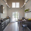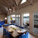 Step inside the oversized glass doors and into the beautiful great room. With high, pickled wood ceilings and cool terrazzo floors, it is a wonderfully balanced space. It features a contemporary dining area, a large banquette sofa with entertainment system, and the enormous kitchen, which also opens to the terrace. It is a gourmet space ideal for meal prep and will become a top gathering spot.