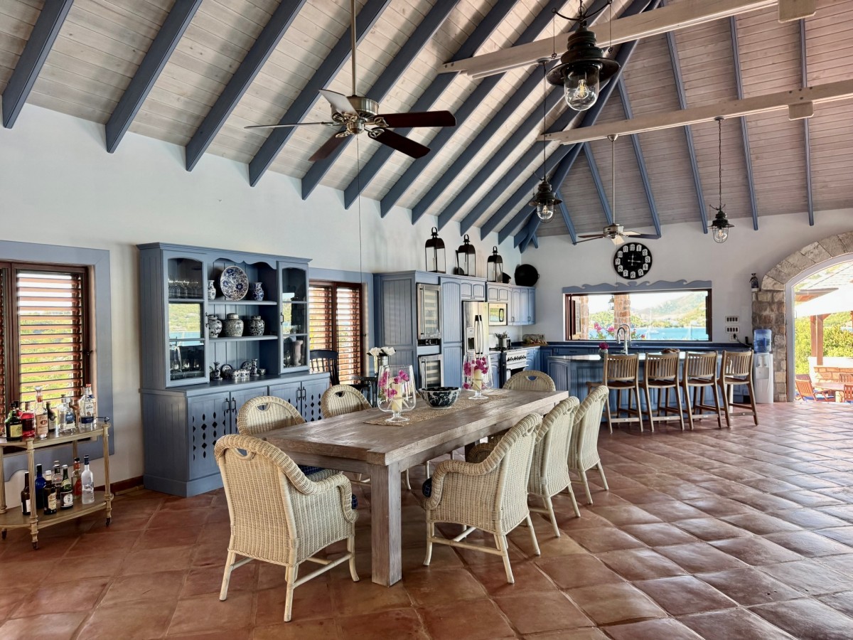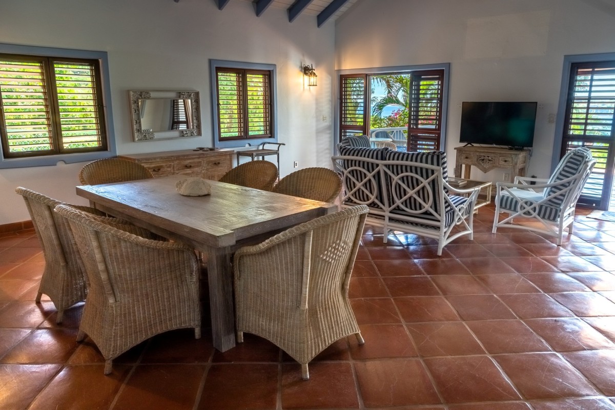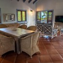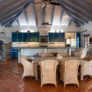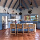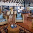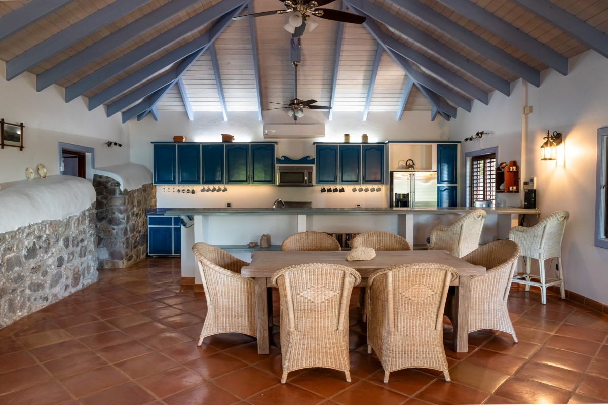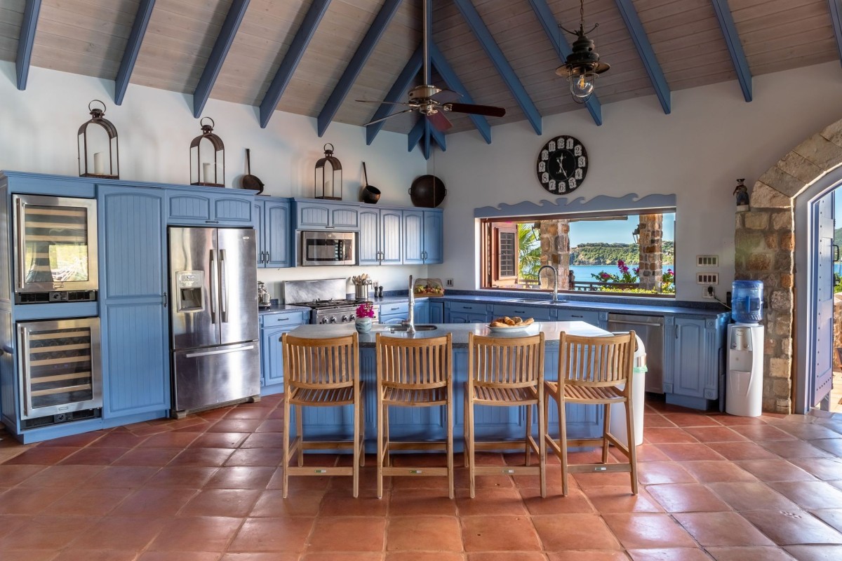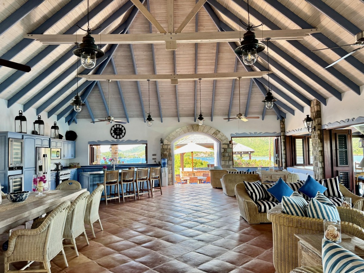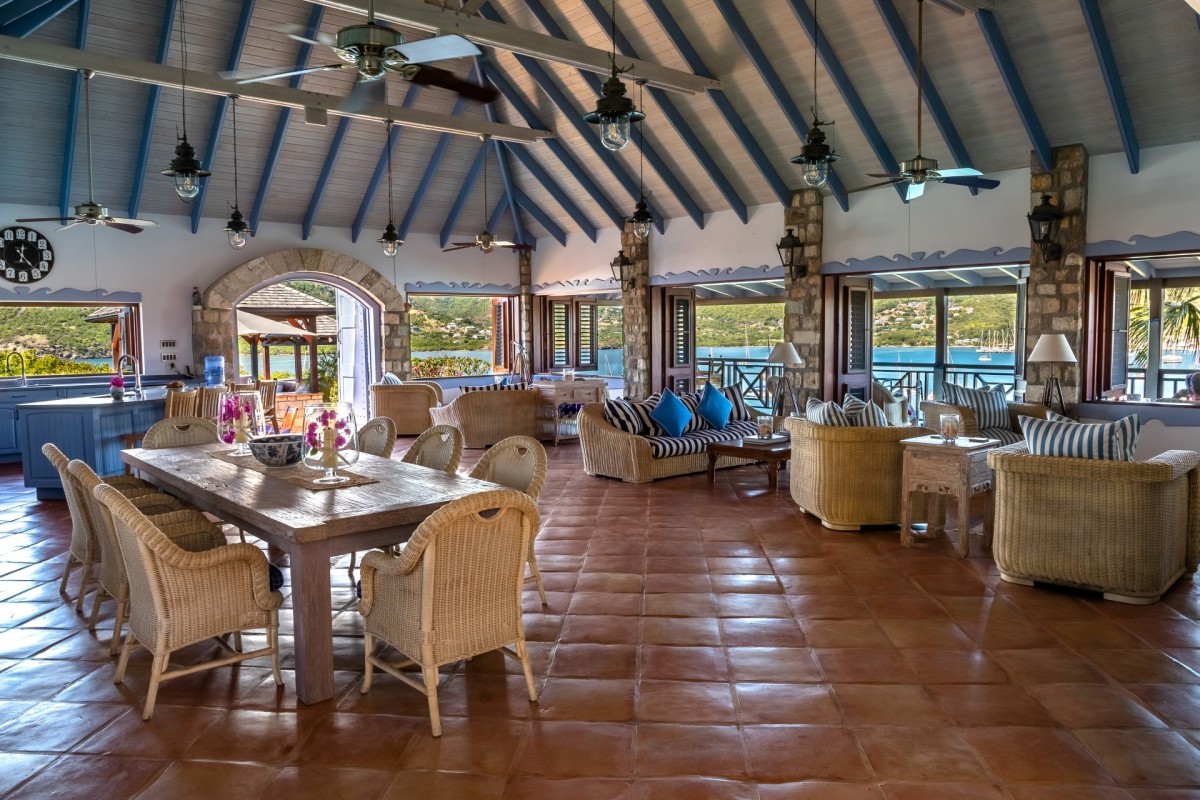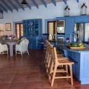 The upper terrace area leads to the equally impressive interiors. A great room features a nautically inspired blue and white palette, but keeps things casual with rattan and wicker pieces that work beautifully with the terrazzo floors. There is a casual living room, dining area and fully-equipped kitchen in the main villa.
