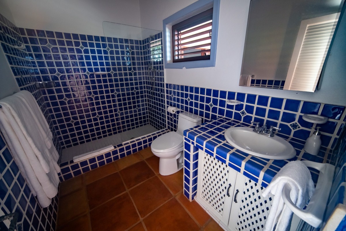 Bedroom 2: Main floor bedroom with a king-size bed (can be made up as two single beds), A/C, ceiling fan, walk-in closet, private veranda with sea and garden views and en-suite bathroom with shower, double vanity and WC. 2 guests maximum.