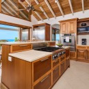 The modern kitchen, tucked conveniently near the dining area, is equipped with state-of-the-art appliances and sleek white marble countertops. Its layout is both functional and inviting, offering views of the pool and the vivid blue waters beyond.