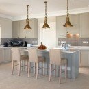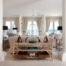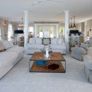 At its back is a bank of oversized glass doors that lead you into the great room. Here, you see true design at work with the white palette of the furniture, flooring and textiles offset with splashes of grey and bold use of wood and accent pieces. The open floor plan here allows you to wander between the living room, dining room and amazing gourmet kitchen. The kitchen is done in stainless steel and features the very best appliances. A breakfast bar is going to be a common gathering place for morning coffee, evening cocktails and everything in between.