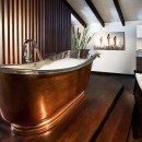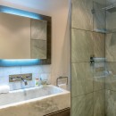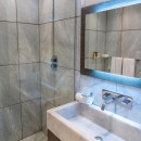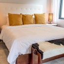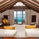 The final bedroom is located on the upper level and comes with a king bed, a dressing area, and a private terrace with water views. It also comes with a modern bathroom with a shower, double vanity, and a bathtub for relaxing after a long day of adventure.