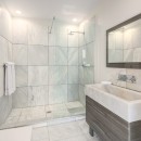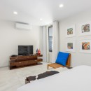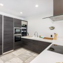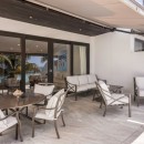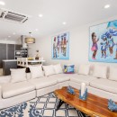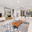 Sleek and cool, the great room has a black, white and sand palette that balances nicely against the scene outdoors. With high white ceilings, the cool terrazzo tile floor, the modern furnishings that include an oversized sofa in the living room as well as an entertainment system, it is a wonderful gathering space. With an open floor plan, it incorporates the dining area and the fully-furnished kitchen with its premium appliances and equipment.