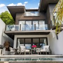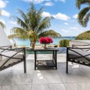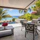 A contemporary design, it has three full floors of living space, and a fantastic assortment of outdoor spaces to enjoy. The heart of the three-story villa is the pool terrace with its infinity-edge pool gazing out towards the private beach. Steps down from the terrace, the fully furnished beach features lounges and seating ideal for any hour of the day or night. The terrace is also furnished as an outdoor living area with oversized lounges, an al fresco dining table, and even a barbecue space. It opens into the great room that is faced with oversized doors and windows to erase the line between interior and exterior living space.