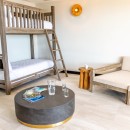 One bedroom in the suite has a king-sized bed, along with a sauna, a television, and a double vanity. The other bedroom is equipped with two bunk beds, a television, and an ocean view. It offers a whimsical space for younger guests in the party.