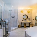 The suite includes a fully equipped kitchen and a spacious lounge area, with ensuite bedrooms situated on either side. Both the master and guest bedrooms feature four-poster beds and luxurious bathrooms complete with both a shower and a bathtub.