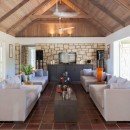 Inside, the use of natural wood, stone, and terra cotta makes for a wonderfully organic feel in each of the rooms. The formal living room has cathedral ceilings, multiple sofas, an entertainment system, a work desk, and library space, and it opens into the dining room. There is also the fully-equipped, gourmet kitchen to enjoy.