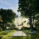 Your first experience of the house will be the refined entrance hall, featuring a marble floor, tropical plants, breezy latticework and visually stunning sculptures. The hall leads into the living room, with a view of the pool, gardens, and the sea beyond. The house is built on a single level, with a central living area located between two wings. The rooms are large, airy and elegant, and the white color scheme with green accents evokes the tropics.
