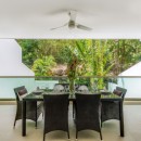 The western terrace, accessible from the living room, offers stunning views of Barbados's breathtaking sunsets. The eastern terrace, adjacent to the kitchen, includes a dining table and overlooks the villa’s pool and lush gardens.