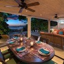 In fact, many travelers may find all that they crave in an island getaway within the confines of the opulent villa. It features a great deal of privacy along with its direct beach access. It also maximizes its location by offering oversized balconies and a ground floor verandah that each serves as an idyllic and comfortably furnished living space. The ground floor space is truly stunning and begins with an oversized stone terrace furnished as a lovely sun bed. Framed by trees and plants, it is a true tropical retreat, and it butts up against the verandah that features smooth tile floors and island-inspired design and décor. There is the airy lounge, a formal al fresco dining spot, and a small breakfast area.