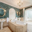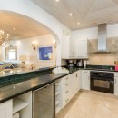 Just indoors, through the massive archways, is the open floor plan living space. A visual delight, it is decorated in a pale palette that bursts with pops of color from the high-end furnishings and art that have been put to use. The large and formal living room includes oversized chaise lounges, an entertainment system, and several large sofas for hours of relaxation. This area leads into the dining area and then to the kitchen. Arched openings ensure that you don't miss a thing even in the midst of preparing snacks or food. Of course, visitors can enjoy the services of their own cook as well as a housekeeper, butler and manager.