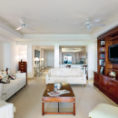 It begins with that amazing terrace and patio area. Furnished at one end with a sun bed and a massive banquet sofa and at the other with al fresco dining. It leads directly to your private path to the beach just beyond the row of low trees and palms. You enjoy total privacy but instant access to the beach, or you can opt for a quick dip in the plunge pool that abuts the terrace as well. Just inside, is the great room with formal living room, and this leads into your television room, also elegantly furnished in a pale and soothing design. This takes you to the gourmet kitchen where you can have your cook make meals or you can spend time experimenting too.