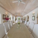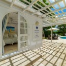 This beautiful building combines Jacobean architecture with French farmhouse decor, complete with a chandelier and gold-tasseled, white silk furniture duvets in the main dining area. Using archways to open up the back of the villa onto a poolside terrace, garden, and lounge area, the transition from indoor entertaining to outdoor is seamless. An alfresco dining set, two rockers, and a porch couch with shocking-blue accent pillows on white wicker occupy one side of the terrace while a coffee table and wicker-rattan lounge set occupy the other near an open, half-dome serving window that leads to the kitchen—the perfect place for brunch by the pool.