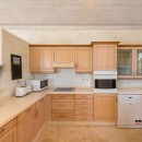 The villa exudes a bright and airy ambiance, characterized by expansive stone walls and lofty ceilings in the living room. The furniture is tastefully appointed in neutral tones with subtle hints of baby blue for added visual appeal. A formal dining area, accommodating six people, is situated adjacent to this space, while the modern kitchen is in close proximity, furnished with contemporary appliances and wooden cabinetry.