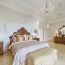 The generously sized pool serves as the focal point of the villa, surrounded by meticulously landscaped gardens.