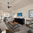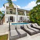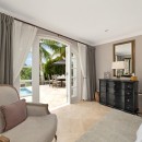 A four-bedroom gem, it is designed with a blend of island and modern style. It features a long list of amenities, with the pool and garden areas ranking at the top of the list. The pool is an oversized plunge pool that is framed by mature palms and gorgeous tropical gardens. At the front is an oversized banquette sofa serving as the ultimate outdoor lounge. The terrace backs up to the villa itself and opens into two of the bedrooms.