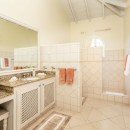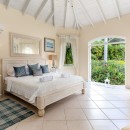 Bedroom 4: Main floor bedroom with a king-size bed, ceiling fan, A/C, TV, WiFi, safe, pool access, and en-suite bathroom with shower, vanity and WC. 2 guests maximum