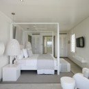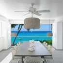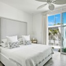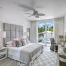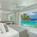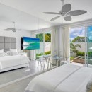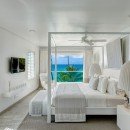 The larger main property at Footprints Estate has five bedrooms and is located on the west coast of the island. It features more than 6,500 square feet of space with many stories of terraces and balconies. The interior was designed by Kelly Hoppen and features a media room, fitness area, and a formal kitchen and dining room. The master bedroom has gorgeous floor-to-ceiling windows with a view of the Caribbean.