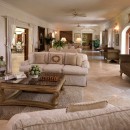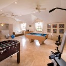 Just indoors, the formal living spaces are cool and soothing, featuring many lounge areas, a formal dining room, and the full-sized gourmet kitchen. There is a fitness room and a gaming room with entertainment center and billiards as well.
